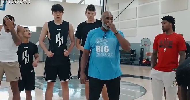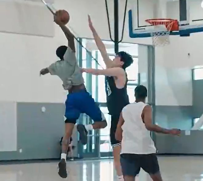 同时在视频进行到6分半钟的时候可以看到,对手还试图隔扣杨瀚森,结果直接被他给干扰了下来,球也没进。另外杨瀚森在场上移动的很多,内外线开花防守出彩,虽然只是一场普通的野球,可是也同样的很专注。
