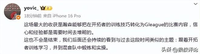 开拓者记者“yovic”发文点评:“这场最大的收获是瀚森能够把在开拓者的训练技巧转化为Gleague的比赛内容,信心和经验都是需要时间去堆砌的。